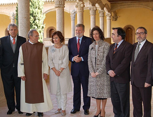 De esquerda a dereita: O Director de Conservación de Patrimonio Español; o abade do Mosteiro de Yuste; a ministra de Cultura, Carmen Calvo; o presidente da Junta de Estremadura, Rodríguez Ibarra; a conselleira de Cultura da Xunta de Galicia, Ánxela Bugallo; o conselleiro de Cultura estremeño e o director do Arquivo da Coroa de Aragón
