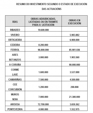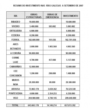 En total, está previsto un investimento de 650 millóns de euros (do que participa en ocasións a Confederación Hidrográfica do Norte), dos cal 226 xa están en execución, co obxectivo de que no ano 2010 todas as rías galegas conten cun sistema de depuración terciario, é dicir, cun sistema de desinfección axeitado para tratar os coliformes, responsábeis directos das oscilacións na calidade das augas para o marisqueo.
