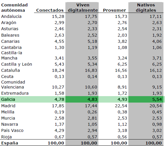 No caso de Galiza, contabiliza 2.728.772 habitantes, dos que 717.217 están conectados. Deles, 438.050 viven dixitalmente, dos que 143.623 son "prosumer". Finalmente, 55.556 desas parsoas son "inmigrantes dixitais". En relación co total do Estado, no noso país só están o 4,78% das persoas conectadas, pero as porcentaxes medran a medida que analizamos o uso activo da rede. Así, temos o 4,83% das persoas que viven dixitalmente, o 4,93% dos "prosumers" e o 5,54% dos nativos dixitais. No outro estremo está unha comunidade con alta porcentaxe de internautas como Cataluña, onde as proporcións se inverten, pasando do 18,24% de conectados a só o 16,12 de "nativos".