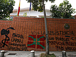 A pasada sexta feira uns encarrapuchados asaltaron o predio da embaixada española armados con bombas lacrimóxenas, e pintaron a súa fachada con lemas coma "Viva a loita dos pobos mapuche, palestino e País vasco", a carón do anagrama de ETA.