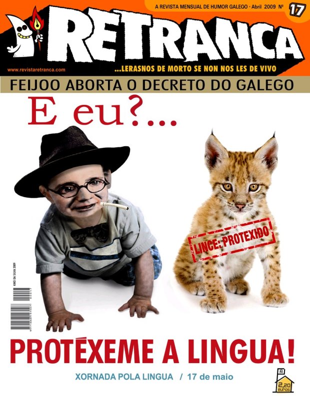 Titular 1: Os galegofalantes teñen menos protección que o lince ibérico. Titular 2: Feijoo aborta o decreto do galego. Así se presenta o número 17 da Revista Retranca, que na súa portada fai referencia á 'Xornada pola lingua' convocada para o 17 de maio. Estará nos quioscos a partir de finais desta semana, con moitos máis contidos unidos pola temática do idioma, a imposición lingüística, a discriminación do castelán e outros chistes.