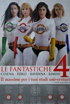 O centro de ensino superior personifica en catro rapazas, dúas louras e dúas morenas, os catro campus da universidade: Cesena, Forlì, Ravenna e Rimini. As mozas, enfundadas en monos de licra de cor branca e con braguiñas negras, preséntanse como 'Le fantastiche 4' (as catro fantásticas). As superheroínas preséntanse como "o máximo para os teus estudos universitarios", obviando outros aspectos como a súa tradición ou a calidade educativa, ou que teña a súa sede na cidade que lle deu nome ao Plan Boloña.